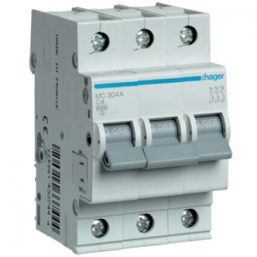 Автоматический выключатель Hager MC304A 3-полюсный, In=4 А “C” используется для защиты кабелей и проводов от перегрузки и токов короткого замыкания. Монтируется на DIN-рейке в электрических распределительных щитках.Соответствует степени защиты IP20.