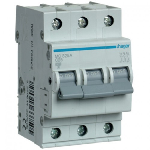Автоматический выключатель Hager MC325A 3-полюсный, In=25 А “C” используется для защиты кабелей и проводов от перегрузки и токов короткого замыкания. Монтируется на DIN-рейке в электрических распределительных щитках.Соответствует степени защиты IP20.