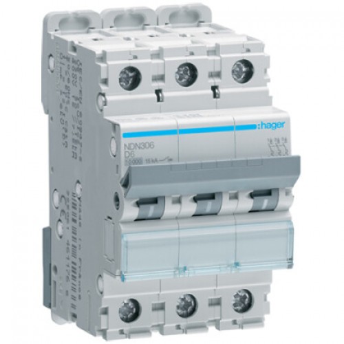 Линейный автоматический выключатель Hager NDN306 3-полюсный, In=6 А “D” для трехфазной сети. Используется для защиты кабелей и проводов от перегрузки и токов короткого замыкания. Монтируется на DIN-рейке в электрических распределительных щитках.Соответствует степени защиты IP20.